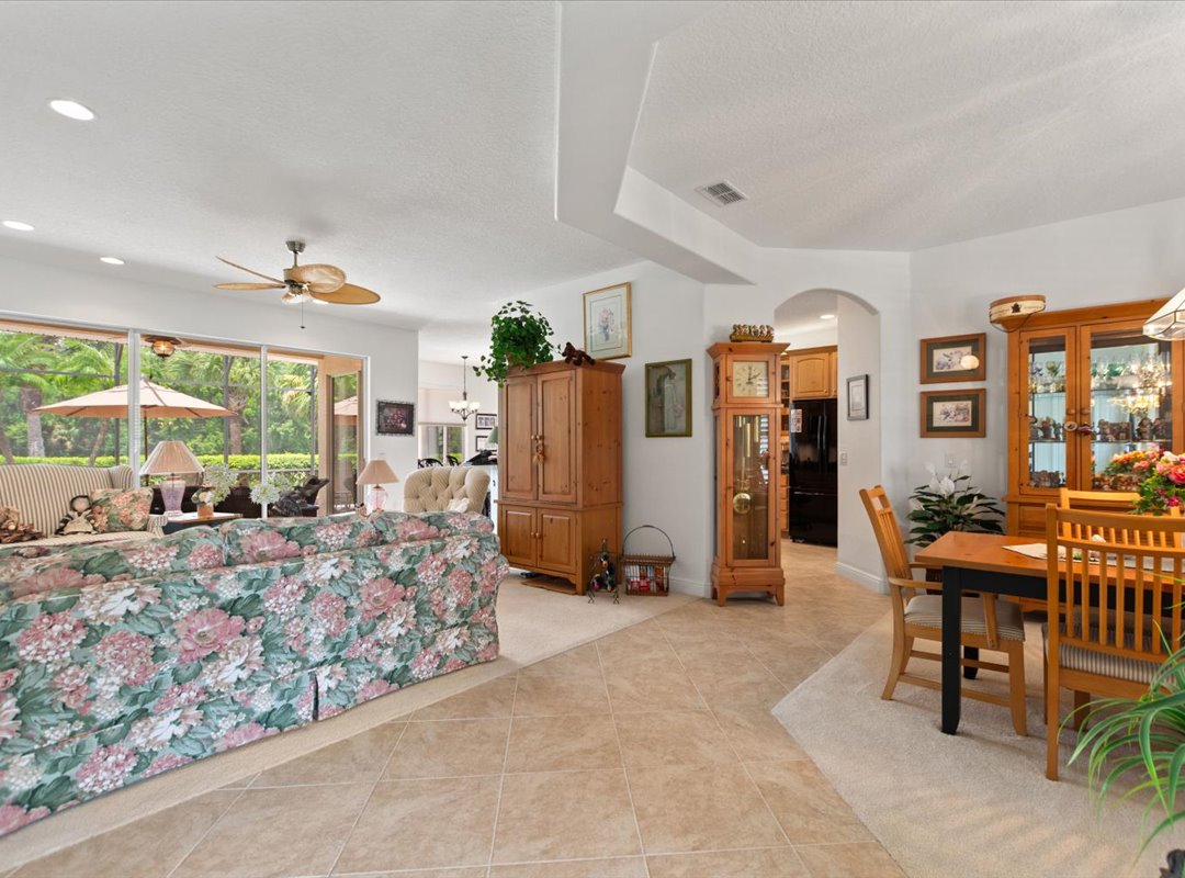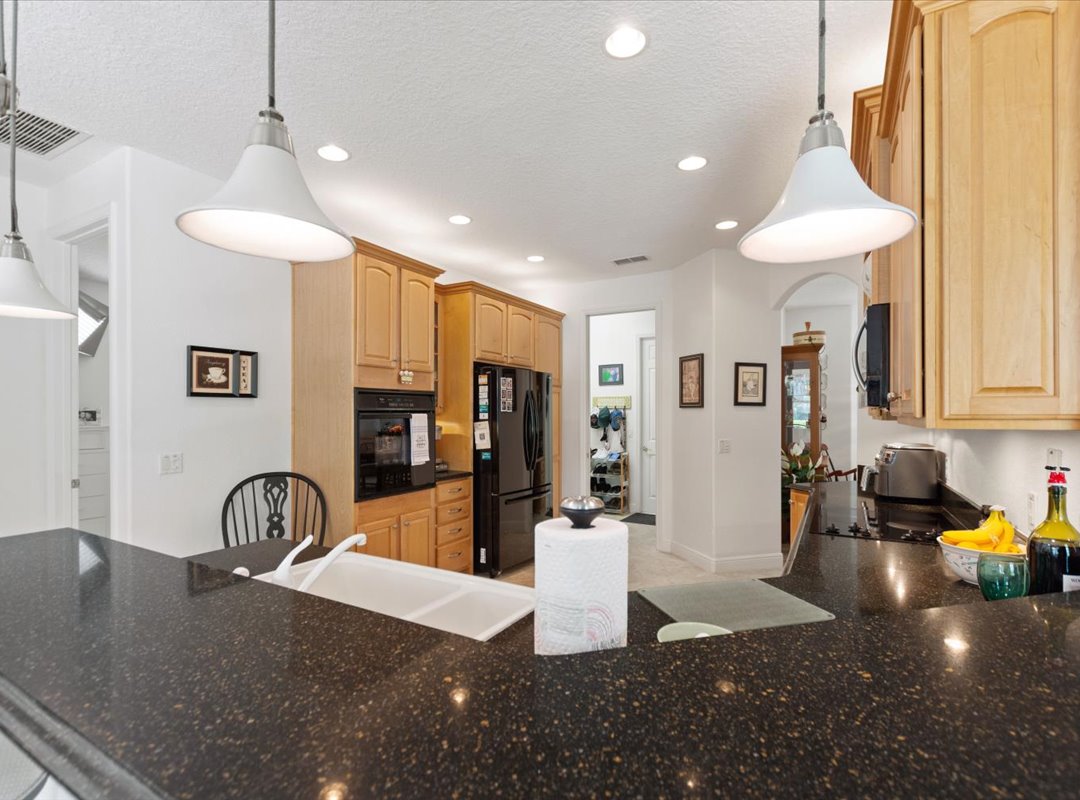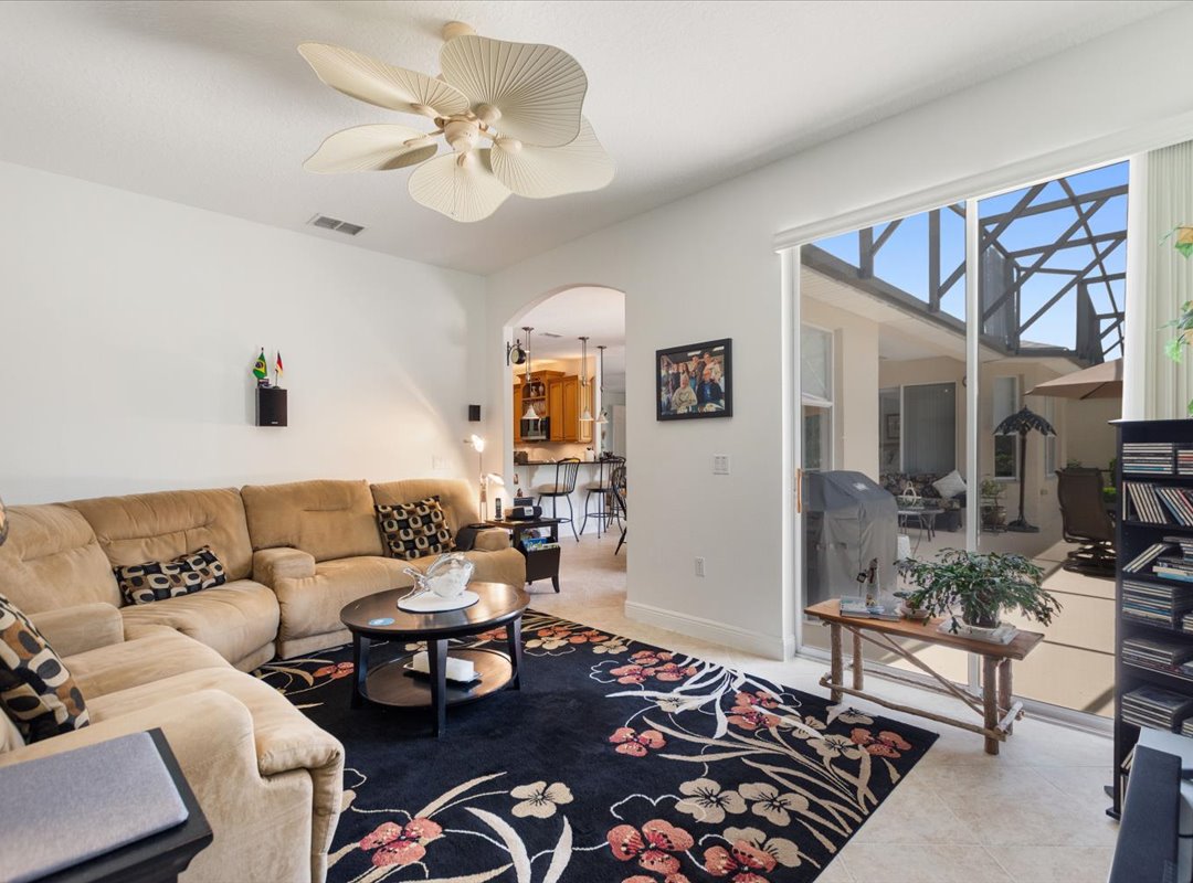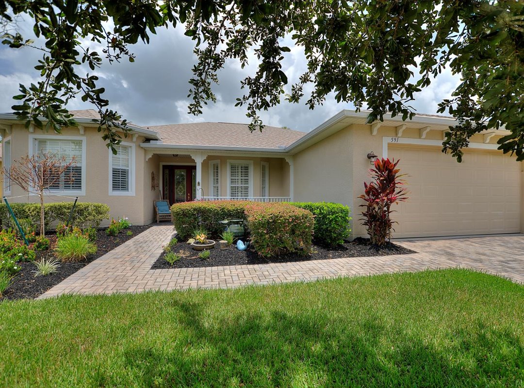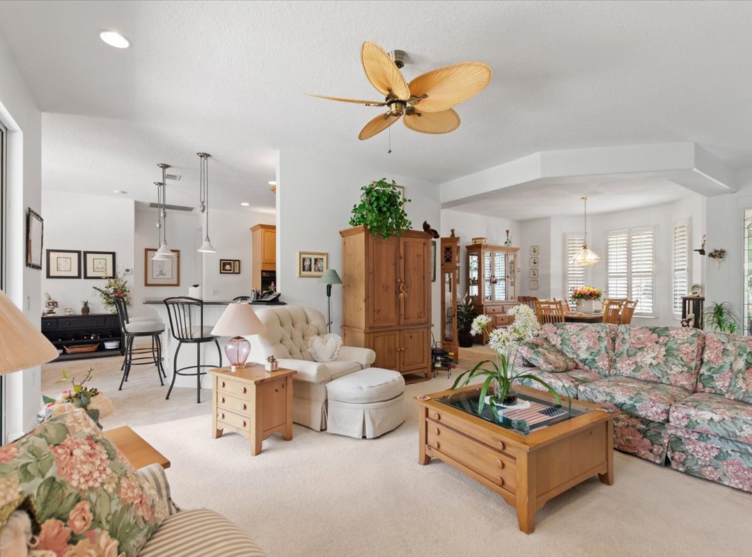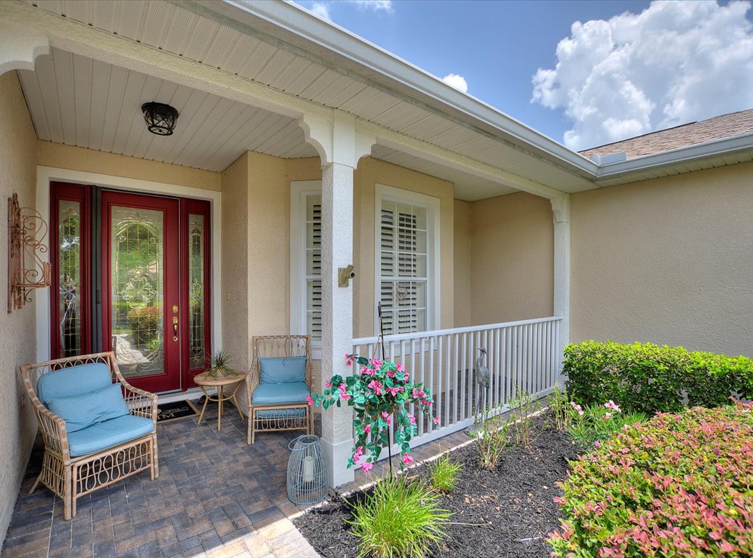 Fall in Love with this Stunning Customized Carnegie Model Home located in Solivita, the award winning 55 Plus Community! Situated on the 5th tee of Stonegate Golf Club’s Oaks course, this immaculate, 2-bedroom 2 bath family-sized home is an entertainer’s dream. Designed with both comfort and style in mind, it features a spacious open-concept great room and dining area, a beautifully updated custom kitchen, and a versatile Florida/Family flex room—perfect for relaxing or hosting guests. Step through the sliding doors to the covered lanai with a fully screened extension complete with an exterior water faucet, where you’ll enjoy uninterrupted panoramic views of the fairway and the tranquil preserve beyond. With its extended arched design and poured concrete flooring, this outdoor living space is ideal for dining, lounging, or even catching a rocket launch in the distance. This home features a kitchen with natural wood upgraded 42” upper cabinets accented with under and over cabinet lighting, quartz countertops, a coffee bar area complete with glass inserts in the overhead cabinet, a built-in oven, a cooktop range, a built-in dish rack and shelving above the micro-wave, and a dining nook with sliding glass doors to the lanai, with curtain vertical blinds, and windows that overlook the golf course. The laundry room, with a pocket door, has upper cabinets and a built-in desk. The Main Living area with a ceiling fan has triple sliding glass doors to the lanai and the dining room features bay windows complete with plantation shutters. The Florida/Family Room has a sliding glass door, with curtain vertical blinds which open to the extended lanai, and blinds on all other windows. The main bedroom features bay windows with shades, 2 walk-in closets with pocket doors, a linen closet, a sliding glass door with curtain vertical blinds, that opens to the lanai, a raised ceiling insert with crown molding and ceiling uplighting and a ceiling fan. The Main bathroom is complete with a shower and separate tub area, dual high counter vanities, a make-up vanity, and bay widows with plantation shutters. The guest bedroom features a double wide closet and window blinds, and the guest bathroom has a shower with glass doors. The extended garage with attic storage, includes a work sink, ceiling fan and an additional exterior water facet outlet inside the garage. From elegant dinners to card nights and trivia parties, this home is built for making memories. The thoughtful layout flows effortlessly from room to room, offering the perfect blend of sophistication and warmth. Don’t miss this rare opportunity to own a home that combines luxury, location, and lifestyle all in one unforgettable package! Come enjoy the incredible lifestyle in Solivita. This vibrant 55+ community features 14 community pools, including an indoor pool complete with a second floor running track, 2 huge amenity centers with gyms and so much more, 2 championship golf courses, 3 restaurants, a ballroom, pharmacy, concierge, full team of lifestyle staff, over 200 social clubs to join, major sports and fitness options such as pickleball, tennis, softball, bocci ball, shuffleboard and much more nestled on over 4200 acres of natural beauty and conveniently located to Disney and other Central Florida attractions. The HOA includes landscaping, irrigation and high-speed fiber TV and internet. Make this your home to own!