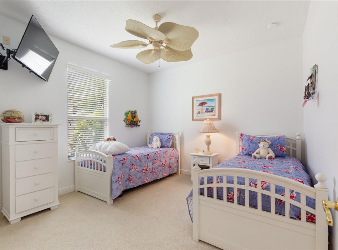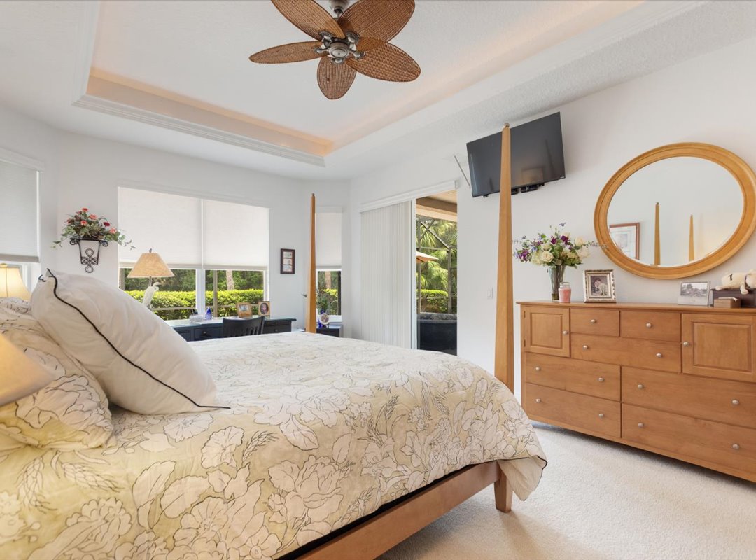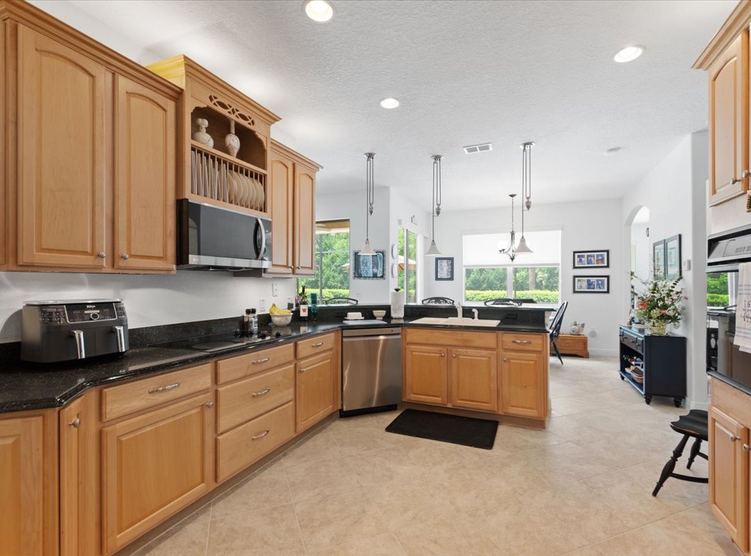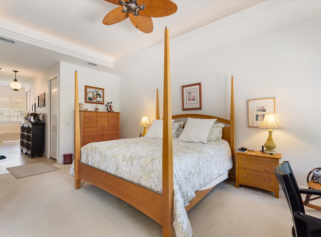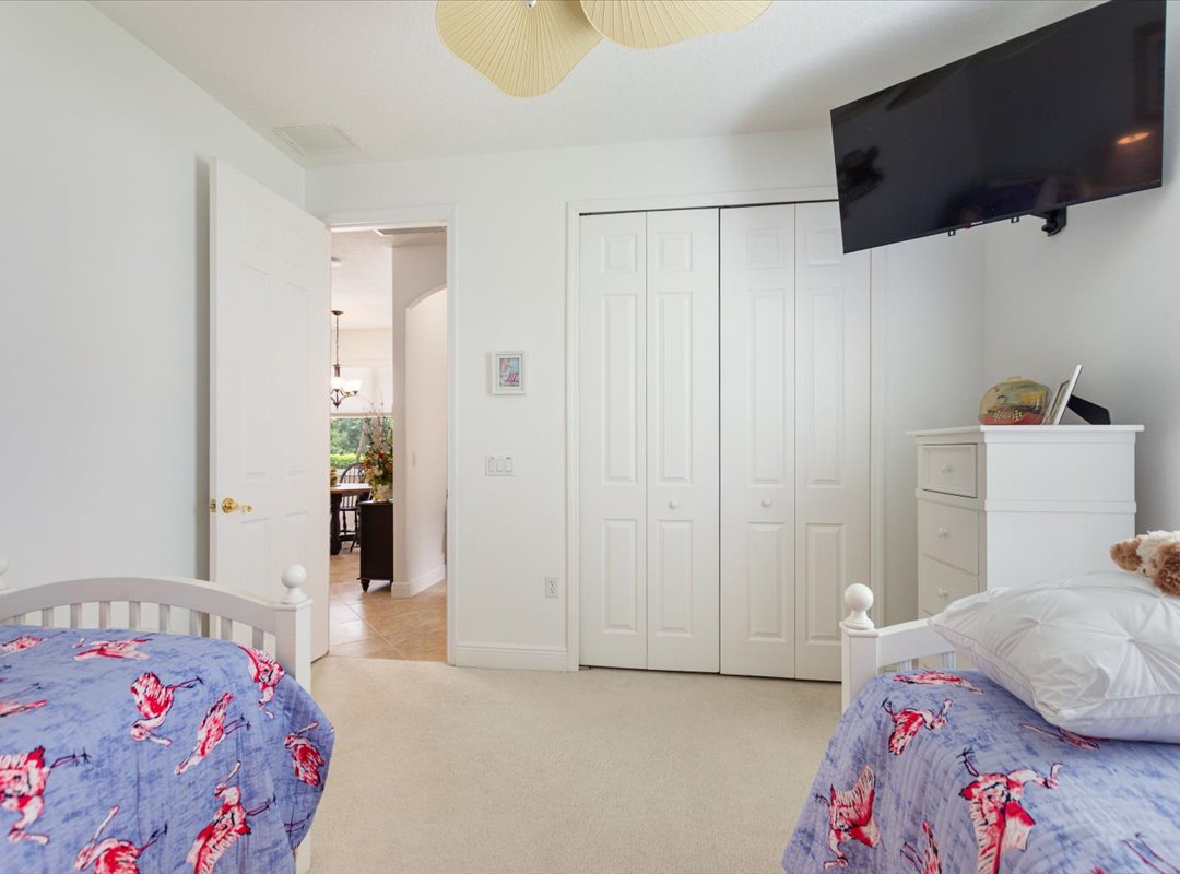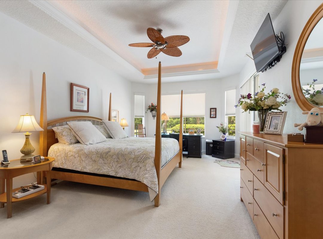 Fall in Love with this Stunning Customized Carnegie Model Home located in Solivita, the award winning 55 Plus Community! Situated on the 5th tee of Stonegate Golf Club’s Oaks course, this immaculate, 2-bedroom 2 bath family-sized home is an entertainer’s dream. Designed with both comfort and style in mind, it features a spacious open-concept great room and dining area, a beautifully updated custom kitchen, and a versatile Florida/Family flex room—perfect for relaxing or hosting guests. Step through the sliding doors to the covered lanai with a fully screened extension complete with an exterior water faucet, where you’ll enjoy uninterrupted panoramic views of the fairway and the tranquil preserve beyond. With its extended arched design and poured concrete flooring, this outdoor living space is ideal for dining, lounging, or even catching a rocket launch in the distance. This home features a kitchen with natural wood upgraded 42” upper cabinets accented with under and over cabinet lighting, quartz countertops, a coffee bar area complete with glass inserts in the overhead cabinet, a built-in oven, a cooktop range, a built-in dish rack and shelving above the micro-wave, and a dining nook with sliding glass doors to the lanai, with curtain vertical blinds, and windows that overlook the golf course. The laundry room, with a pocket door, has upper cabinets and a built-in desk. The Main Living area with a ceiling fan has triple sliding glass doors to the lanai and the dining room features bay windows complete with plantation shutters. The Florida/Family Room has a sliding glass door, with curtain vertical blinds which open to the extended lanai, and blinds on all other windows. The main bedroom features bay windows with shades, 2 walk-in closets with pocket doors, a linen closet, a sliding glass door with curtain vertical blinds, that opens to the lanai, a raised ceiling insert with crown molding and ceiling uplighting and a ceiling fan. The Main bathroom is complete with a shower and separate tub area, dual high counter vanities, a make-up vanity, and bay widows with plantation shutters. The guest bedroom features a double wide closet and window blinds, and the guest bathroom has a shower with glass doors. The extended garage with attic storage, includes a work sink, ceiling fan and an additional exterior water facet outlet inside the garage. From elegant dinners to card nights and trivia parties, this home is built for making memories. The thoughtful layout flows effortlessly from room to room, offering the perfect blend of sophistication and warmth. Don’t miss this rare opportunity to own a home that combines luxury, location, and lifestyle all in one unforgettable package! Come enjoy the incredible lifestyle in Solivita. This vibrant 55+ community features 14 community pools, including an indoor pool complete with a second floor running track, 2 huge amenity centers with gyms and so much more, 2 championship golf courses, 3 restaurants, a ballroom, pharmacy, concierge, full team of lifestyle staff, over 200 social clubs to join, major sports and fitness options such as pickleball, tennis, softball, bocci ball, shuffleboard and much more nestled on over 4200 acres of natural beauty and conveniently located to Disney and other Central Florida attractions. The HOA includes landscaping, irrigation and high-speed fiber TV and internet. Make this your home to own!